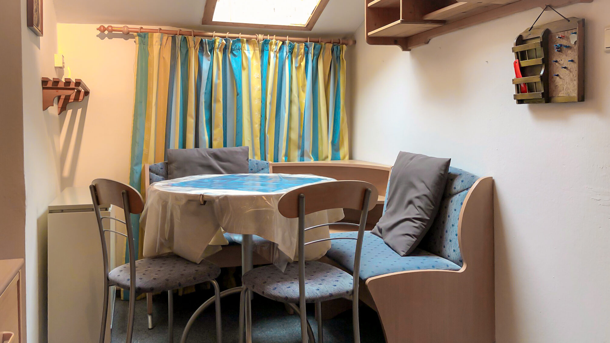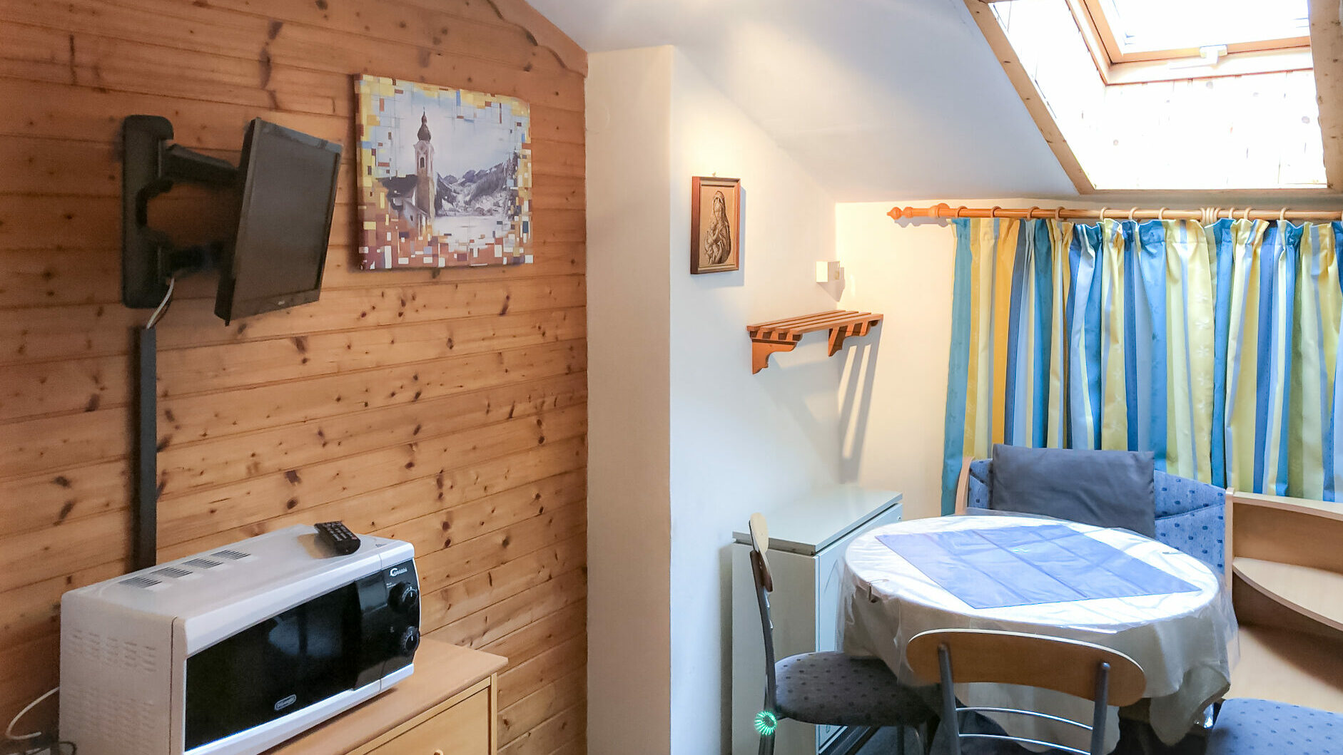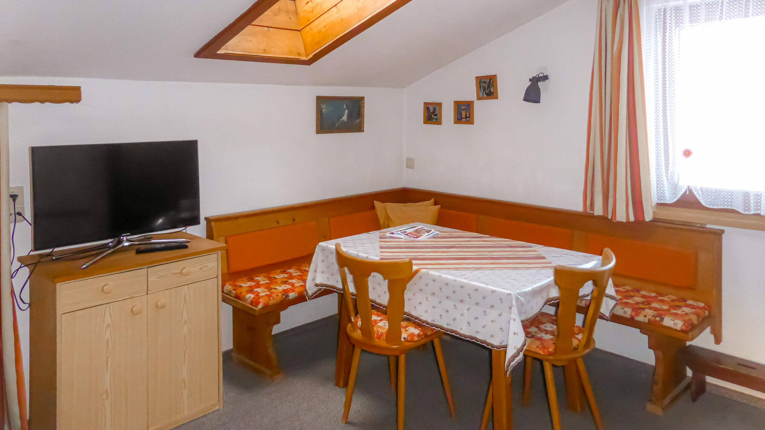 Am Esstisch können bis zu vier Personen Platz nehmen, um einen anstrengenden Skitag gemütlich ausklingen zu lassen.