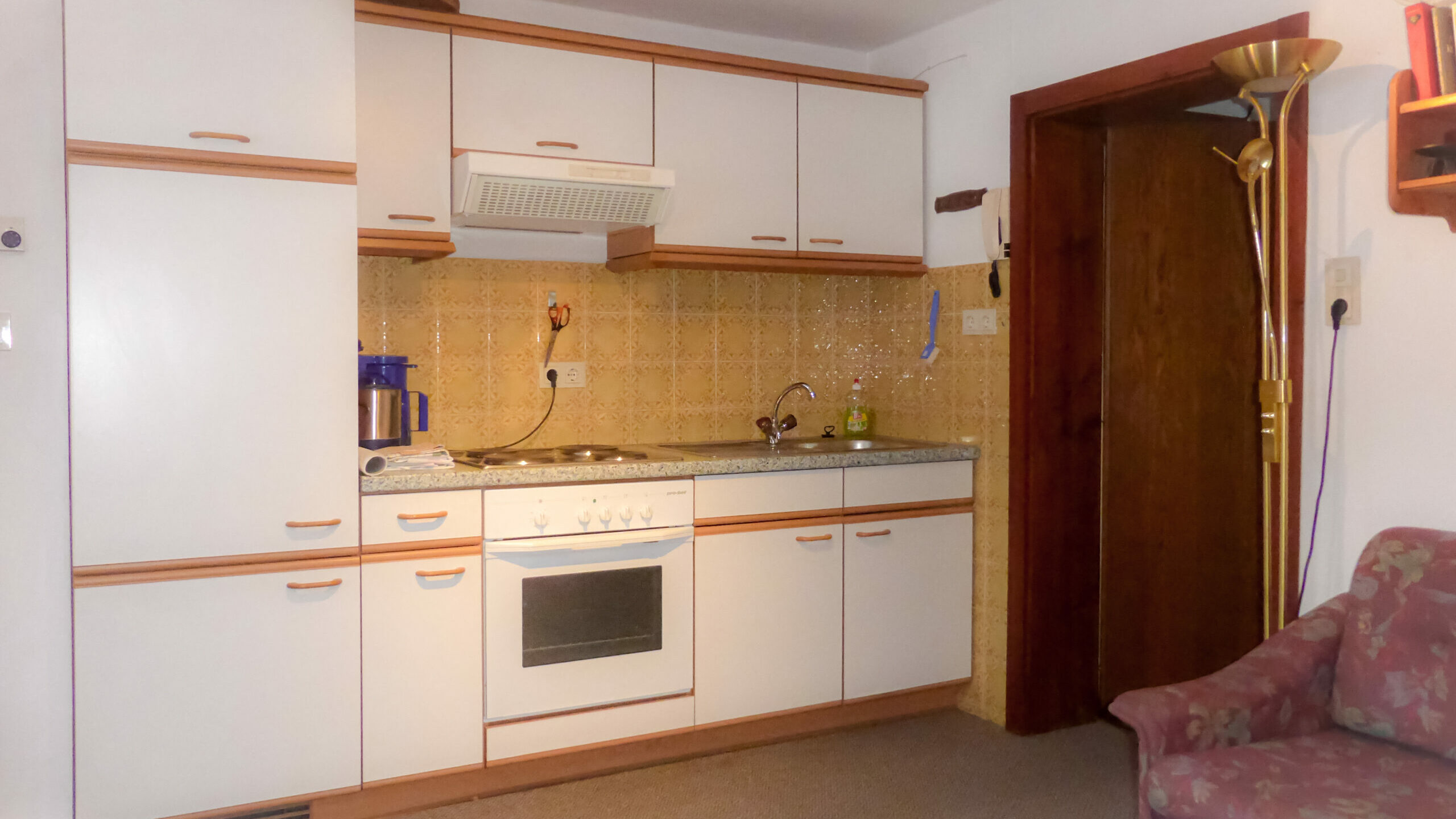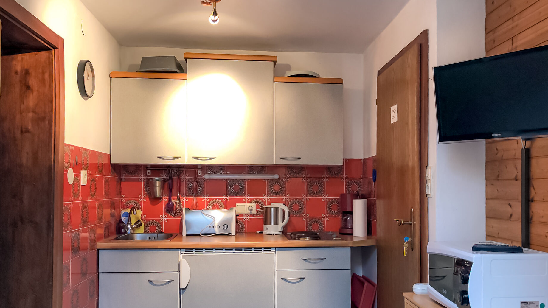 Die integrierte Küche bietet ausreichend Möglichkeiten, um sich selbst zu bekochen. Dazu stehen zwei Kochplatten, ein Mikrowellenherd, ein Kühlschrank und natürlich Geschirr zur Verfügung.